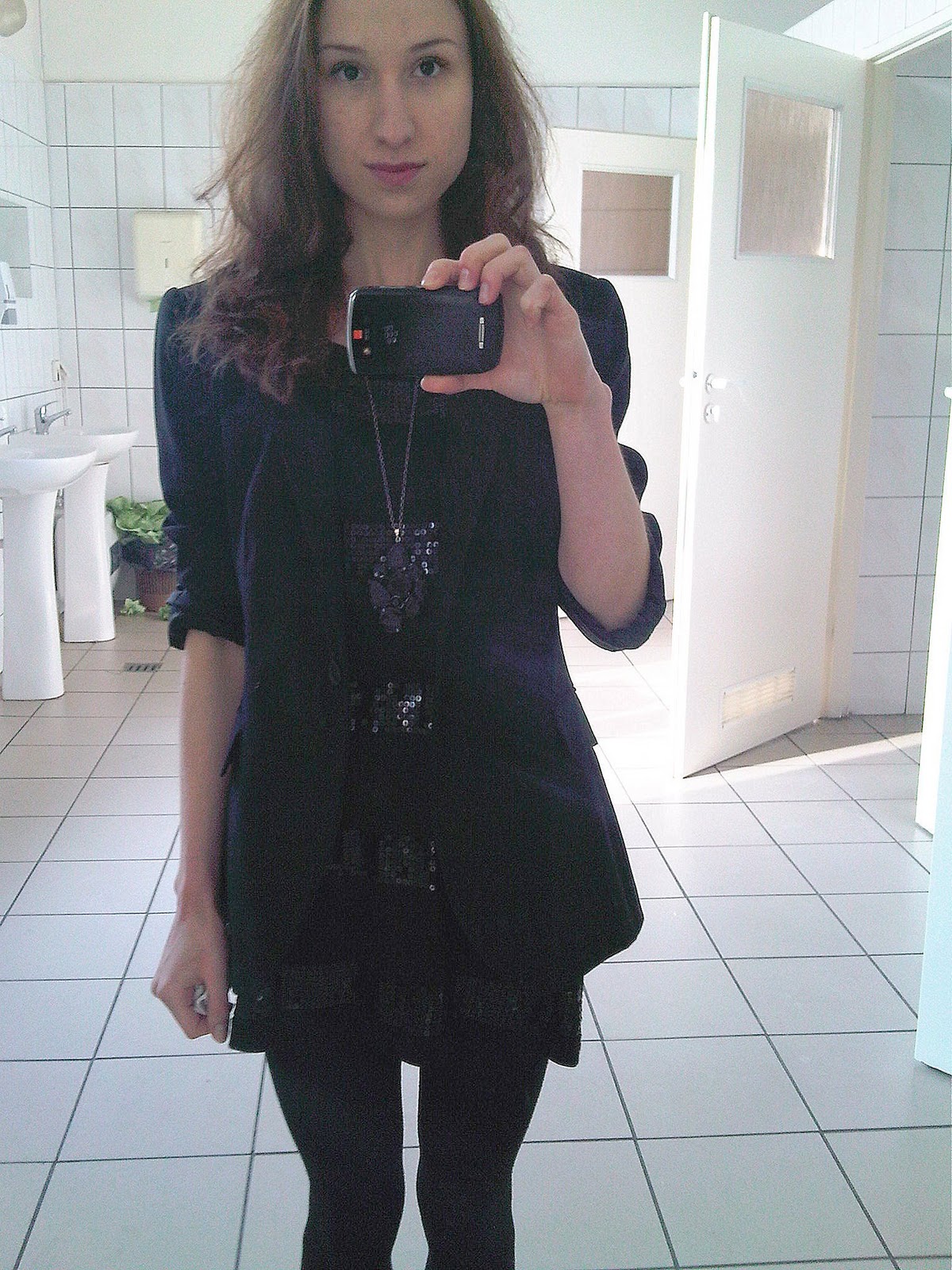 Because of this lazy time my today's outfit at school was very simple - H&M black sequin tunic worn as dress, ZARA blazer, simple black tights, PRIMARK necklace and DEEZEE black pumps on my feet.